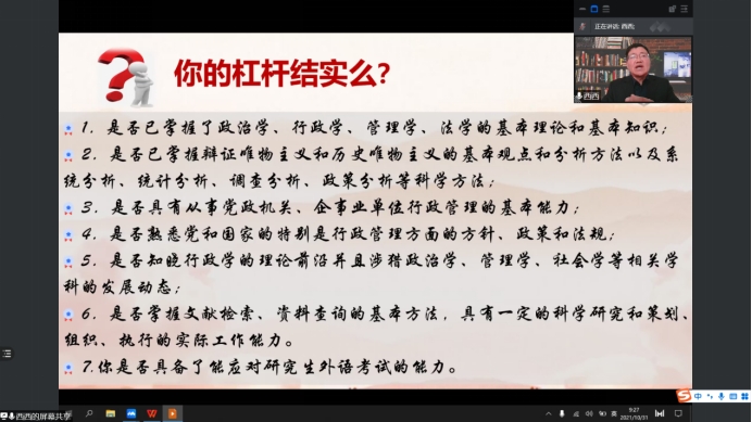 讲座上,岑书记就我国当前形势出发,以“十四五规划”及“二零三五年基本实现社会主义现代化”两个目标为起点,向同学们描绘了未来十多年行管、公管两个专业的同学们的就业蓝图。并用杠杆、支点两个概念,生动形象地为同学们讲述了自身能力和对专业知识掌握程度的重要性,以及对同学们毕业后的工作选择、就业方向、工作前景等等展开了一系列的描述。