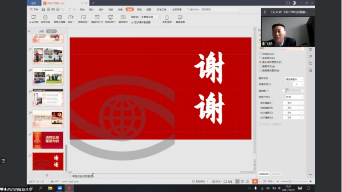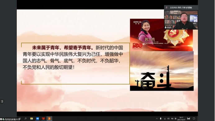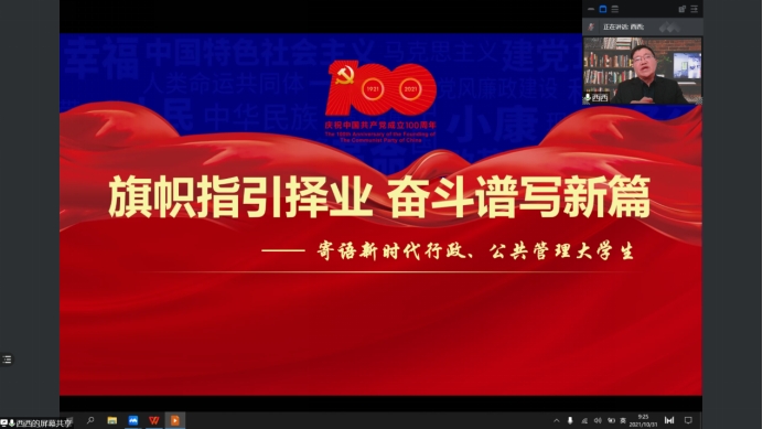 2021年10月31日星期日上午,大庆府民物业管理有限公司西城区项目党支部书记岑国权在公司公共管理系盛情邀请下利用腾讯会议直播平台,为行管、公管专业2018级学子开展毕业实习系列讲座--《旗帜指引择业,奋斗谱写新篇》。公司黄鹏程副经理、郑克岭、颜冰、史春媛、徐晔、韩磊娟、姜郸等老师及2018级全体同学参加该次活动。