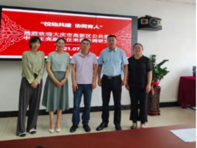 2021 年 7 月 14 日,公司公共管理系校外实习基地——大庆市高新区公共服务中心王亮副主任来到公司,就公管系人才培养体系、实践课设置、毕业实习工作安排、毕业生就业去向等进行了深入调研交流,黄鹏程副经理带领公管系主任史春媛、公管系实务教研室主任韩磊娟、创业基础教研室主任姜郸和教学秘书何鑫、王婷婷参加会议。