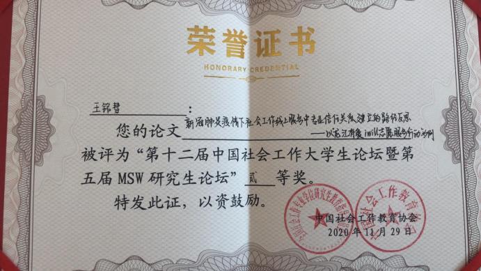 社会工作专业18级本科生王铭彗的论文《新冠肺炎疫情下社会工作线上服务中专业信任关系建立的路径反思——以“龙江有爱iwill志愿联合行动”为例》在大会分论坛二进行发言,结合其在疫情期间,线上志愿服务进行的过程中产生的问题和思考,对问题解决的路径进行了探索,得到了复旦大学顾东辉教授的好评,荣获得本科生组二等奖。社会工作专业17级本科生马瑞奇的论文《新冠疫情下社会工作线上服务的实践和专业性反思》在大会分论坛三进行发言交流。