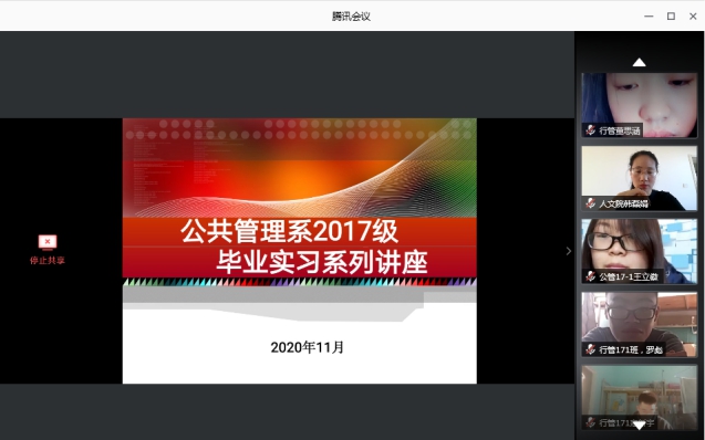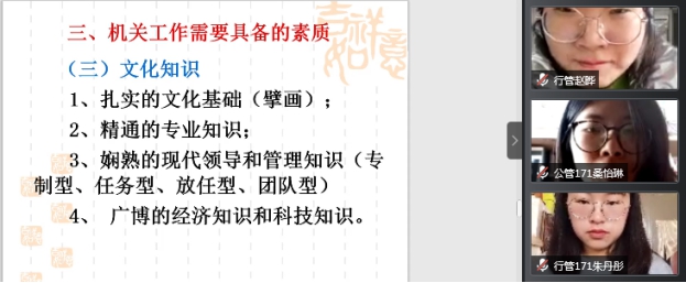 2020年11月28日上午,大庆市委依法治市办科长赵彦峰于腾讯会议平台,为英国上市公司365公共管理系同学开展了一堂关于实习和就业的线上指导讲座。公共管理系主任史春媛主持,徐晔、颜冰、郑克岭等九位实习指导教师以及行政管理和公共事业管理专业全体同学参加了本次讲座。