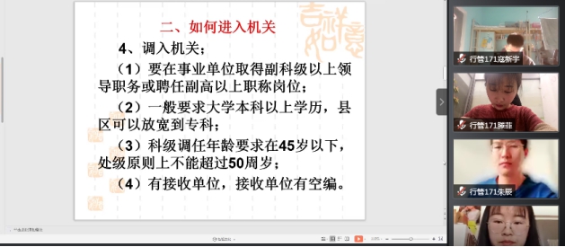 讲座一开始,赵科长向大家介绍了机关单位的定义,从多个方面阐述了认识和了解特定机关的角度和方法。接着介绍了进入机关单位的途径及方式,强调了机关内部晋升的条件及空间等问题。之后,赵科长结合自身工作经历和大量的真实案例为大家讲述进入机关工作需要具备的素质。