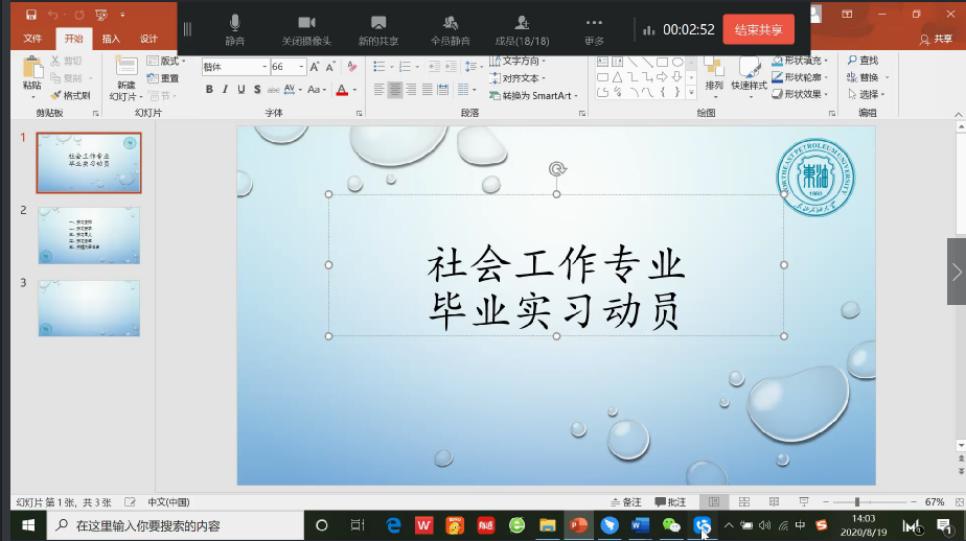 为了迎接即将到来的社会工作专业实习,加强全体同学对专业实习的参与和重视程度,确保实习任务顺利完成,2020年8月19日14时,利用钉钉平台屏幕共享方式,社会学系开展了专业实习动员会。本次活动由社会学系副主任邱心凯老师主持,社会工作专业部分教师和2016级全体同学参加。