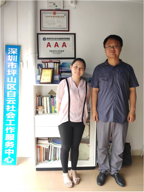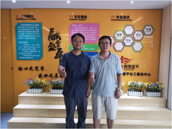 经过前期精心的准备,实习生李晓菲在社会学系教师邱心凯的带领下,于7月10日到达深圳。7月11日,社会学系教师邱心凯与实习生李晓菲,在我系实习基地深圳市坪山区大同社会工作服务中心副总干事我系毕业生赵莹莹的安排和陪同下,参访了我系毕业生王安荣任中心主任的和平社区党群服务中心。同日下午社会学系教师邱心凯与实习生李晓菲又参访了深圳市坪山区大同社会工作服务中心总部,并与机构总干事马老师进行了深入交流。