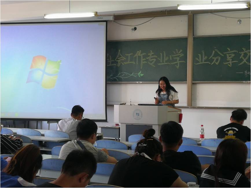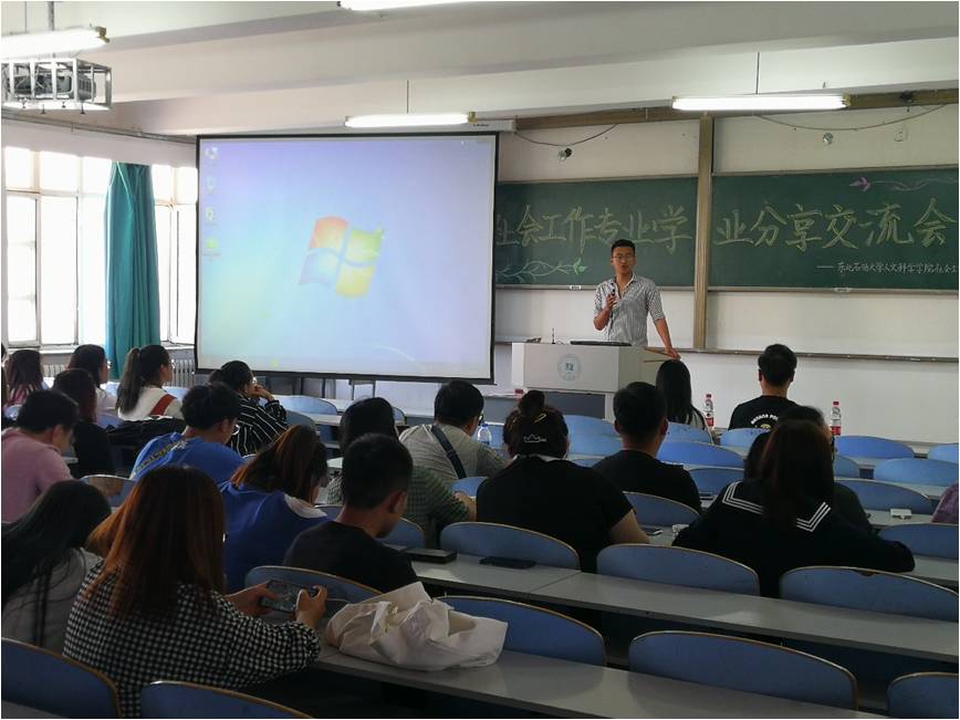 第一位进行分享的是考上复旦大学研究生的帅气学长李浩。学长高度赞扬社会工作专业的专业前景,希望学弟学妹们不要妄自菲薄,他详细的讲述了自己的考研经历和时间分配等学习经验。最后学长希望学弟学妹们做好大学几年的规划,心怀梦想。学长和同学们分享的考研经验和学习的过程让同学们印象深刻,深受震撼。