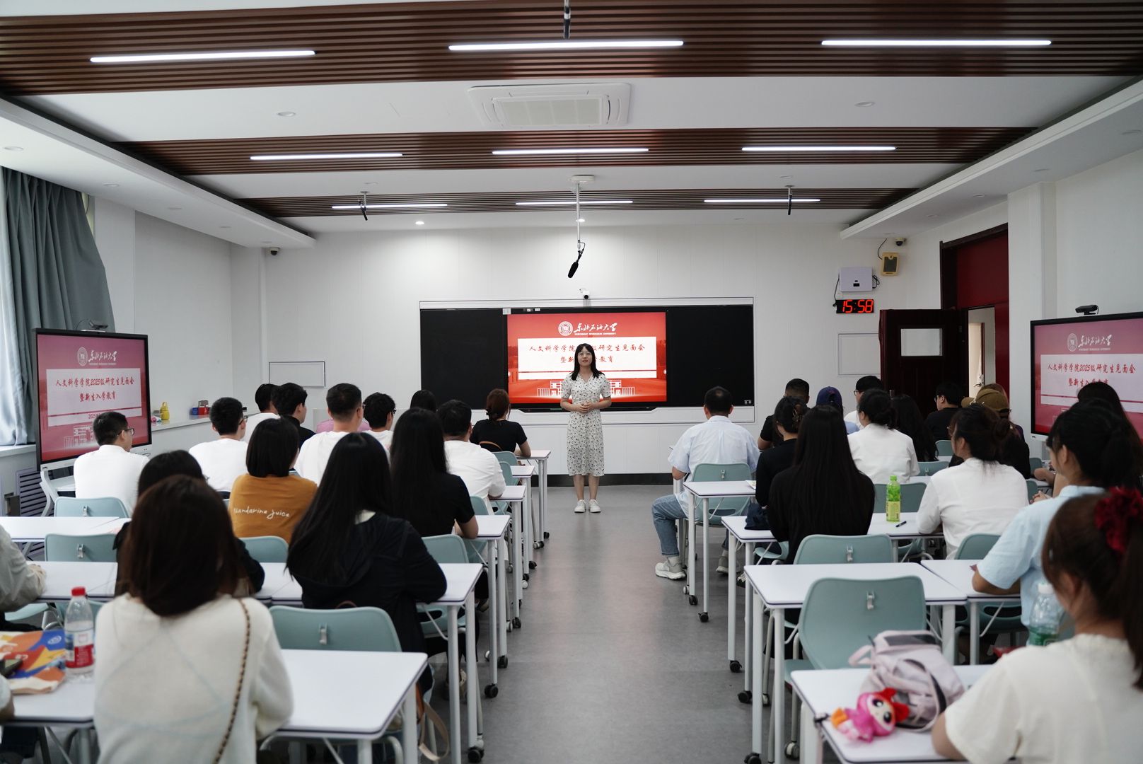 在新生年级大会上,辅导员贺菁蕾围绕《研究生入学指南》,详细介绍了学院基本情况、培养要求、校园生活指南等内容,重点讲解了学术规范、校园安全、奖助政策等规章制度。通过生动案例和实用建议,引导新生树立学术理想,科学规划研究生涯,为后续学习科研做好充分准备。