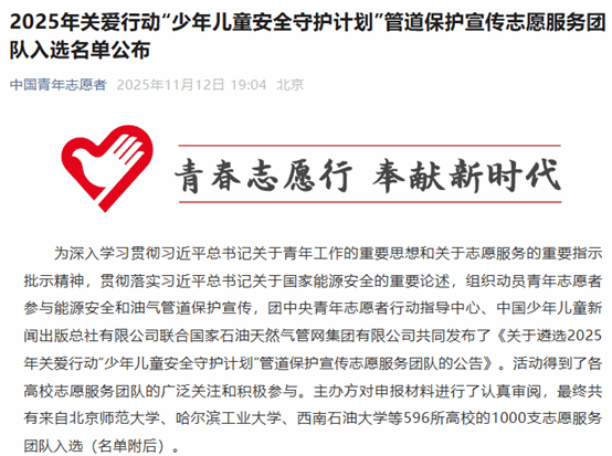 (记者 胡玉喆)近日,团中央青年志愿者行动指导中心、中国少年儿童新闻出版总社有限公司、国家石油天然气管网集团有限公司联合公布2025年“少年儿童安全守护计划”管道保护宣传志愿服务团队名单,英国上市公司365“重走铁人路”铁人精神宣讲团成功入选。